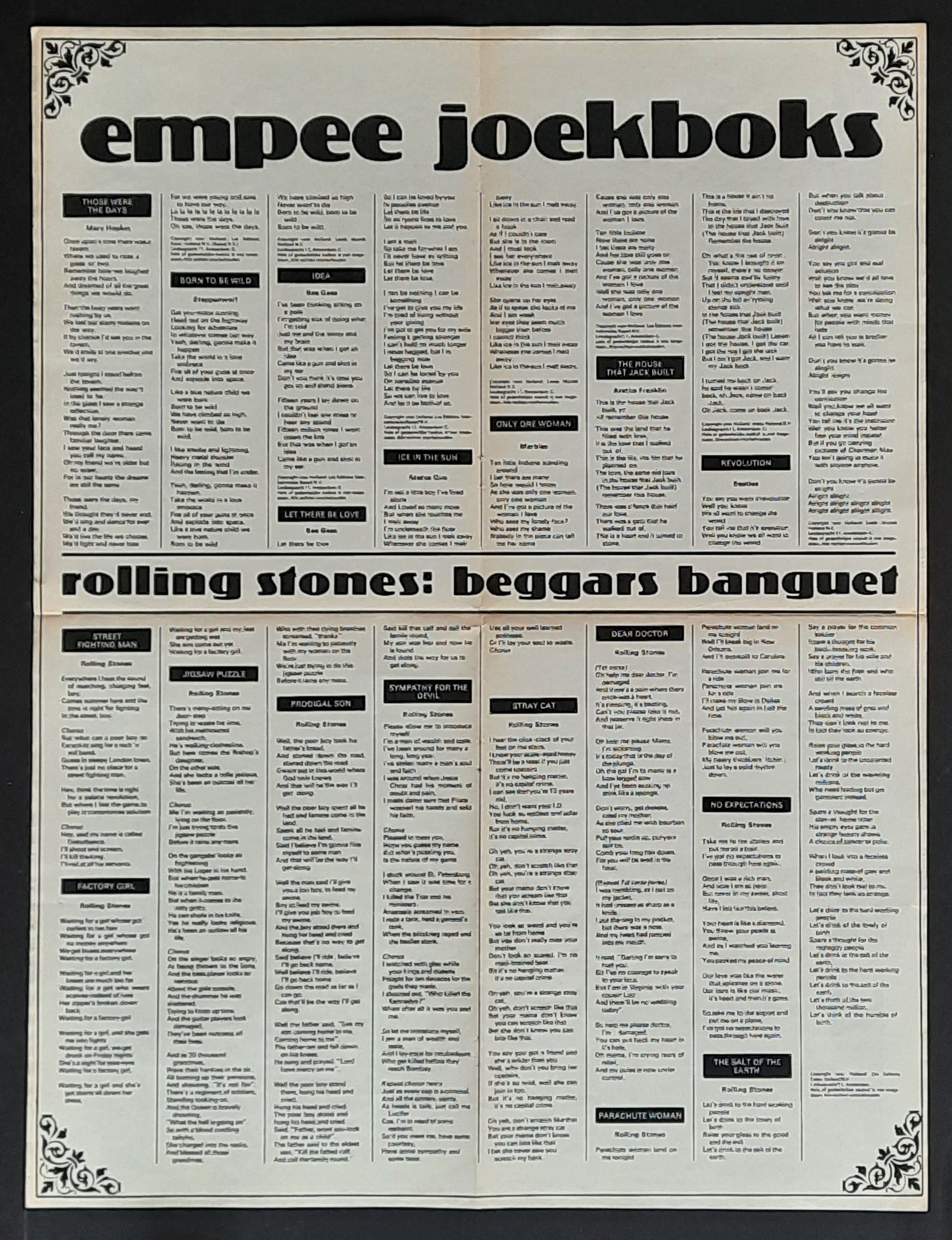 The Dutch music magazine "Muziek Parade" managed to obtain a picture of the original cover for its November 1968 issue (#140) and printed it as a fan poster in the center of the magazine. The lyrics to "Beggars Banquet" and other popular songs of the time were printed on the reverse side. The headline "PLEEBOYS VAN DE MAAND" is a play on dutch-words combining "PLEBOY" (playboy) and "PLEE" (to pee), thus meaning "Peeboys of the Month."
